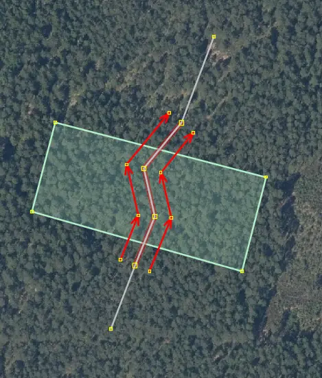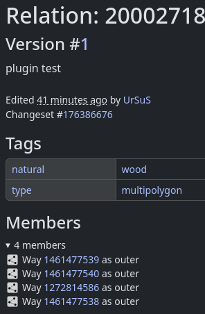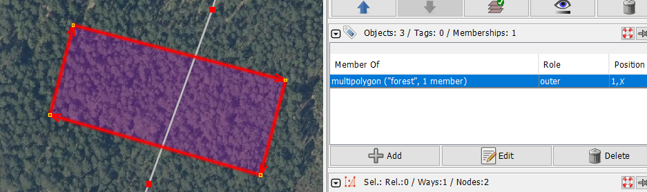Ā, nu tad to vajadzētu instrukcijā. Jāizvēlas 2 punkti, tad shift+x, tad jāizvēlas ceļš un poligons, tad jāvelk no punkta/līnijas. (JOSM saka "drag selected way" bet tas pats par sevi nestrādā neizvēloties gan ceļu, gan poligonu.) Un kas tālāk, kā to operāciju pabeigt? Tagad ir 2 jaunas līnijas