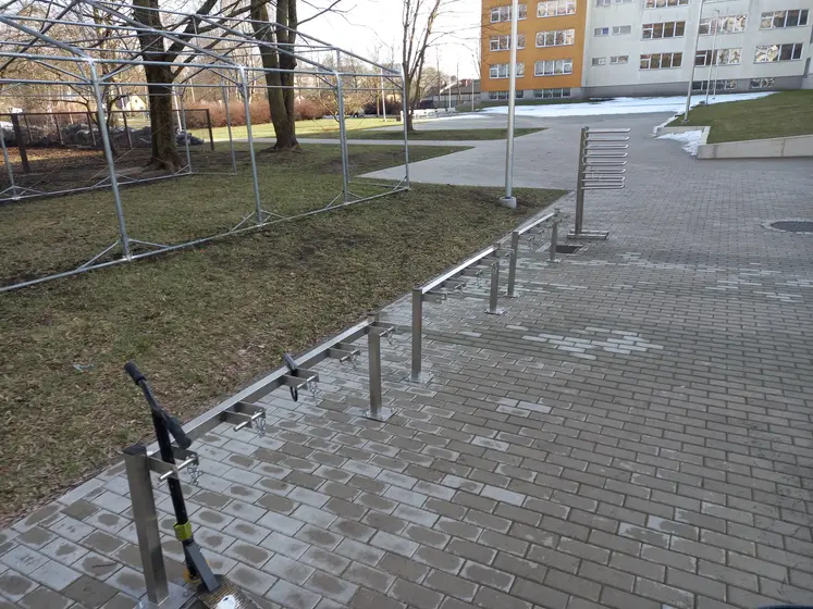 First time I'm seeing these. (Although I don't exactly bike through schoolyards much). Most likely amenity=kick-scooter_parking and amenity=skateboard_parking